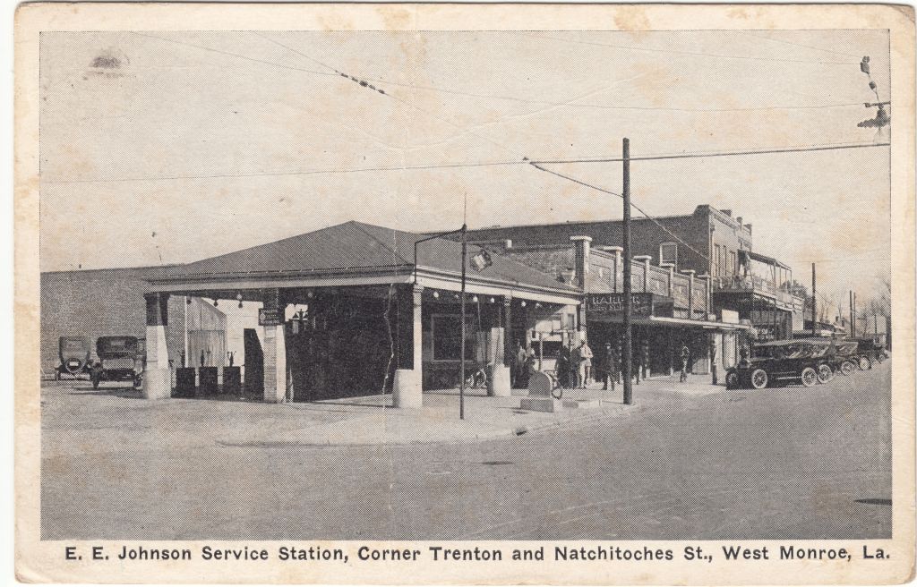 This postcard is a rare one from the 1920’s. When I saw it come up for sale on eBay, I had to have it! It came in last month. The postmark on the back is dated 1929. The first mention of the E.E. Johnson Service Station in the local newspapers came in 1926. This site is where the Rustique Gator once was and the section of Natchitoches on the left is now a park.