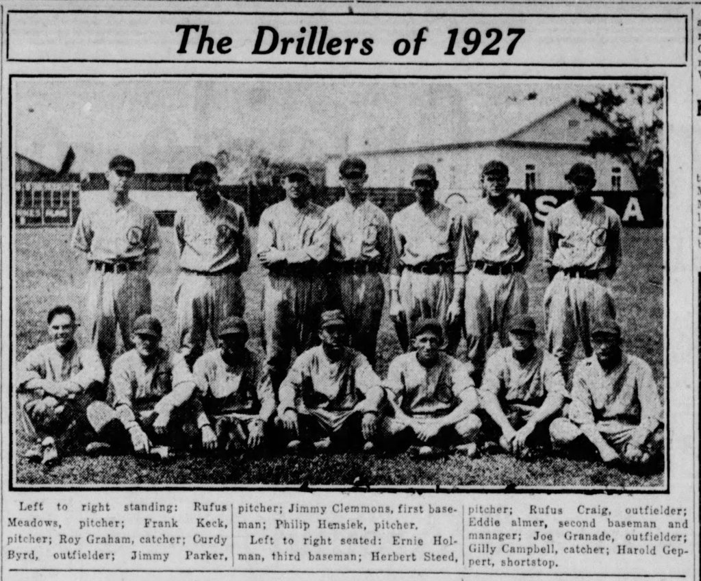 In 1924 organized baseball came back in full bloom and has been established on a sound basis by prominent business men of the city. The first season after their entry into the league for the second time found the local Drillers, as they had been named, fighting for first lace from the first to the last, leading the procession the majority of both halves of the split season, but being beaten out of the pennant by Hattiesburg during the last few days of both halves.