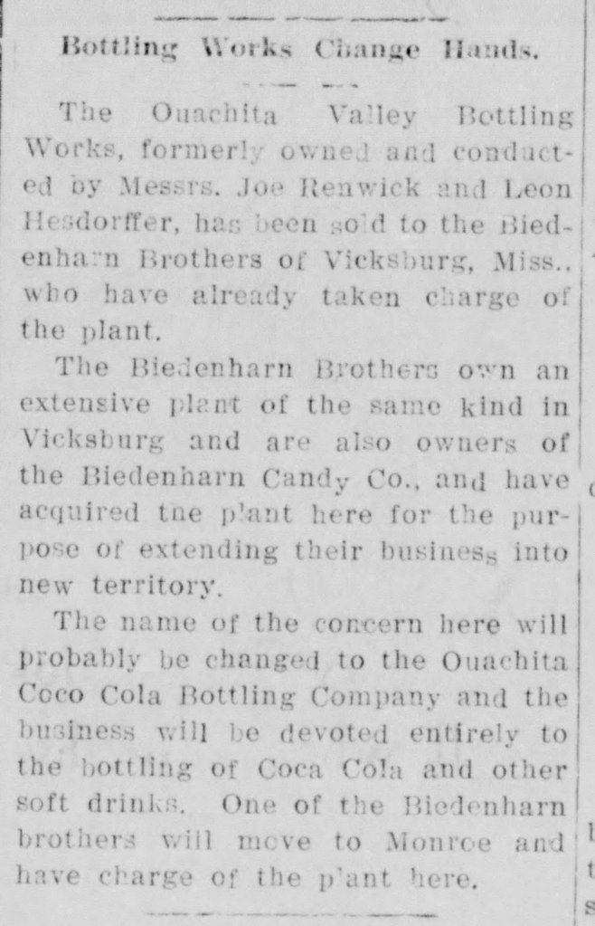 Here is a News Star Article from February 12, 1912, Page 5 announcing the Biedenharn family had bought out the Ouachita Valley Bottling Works and a Biedenharn (that would be Joseph) was coming to take it over.